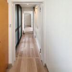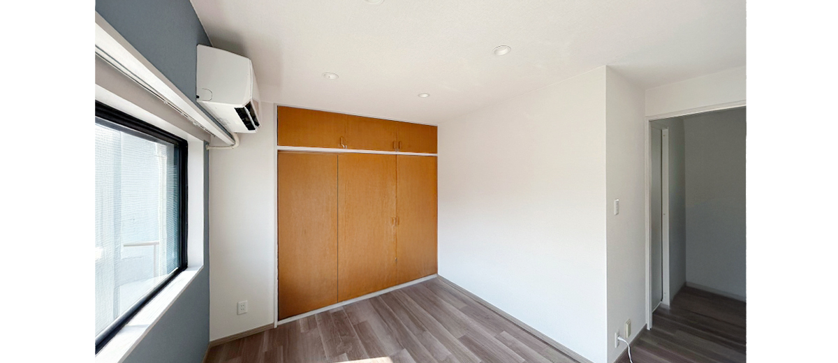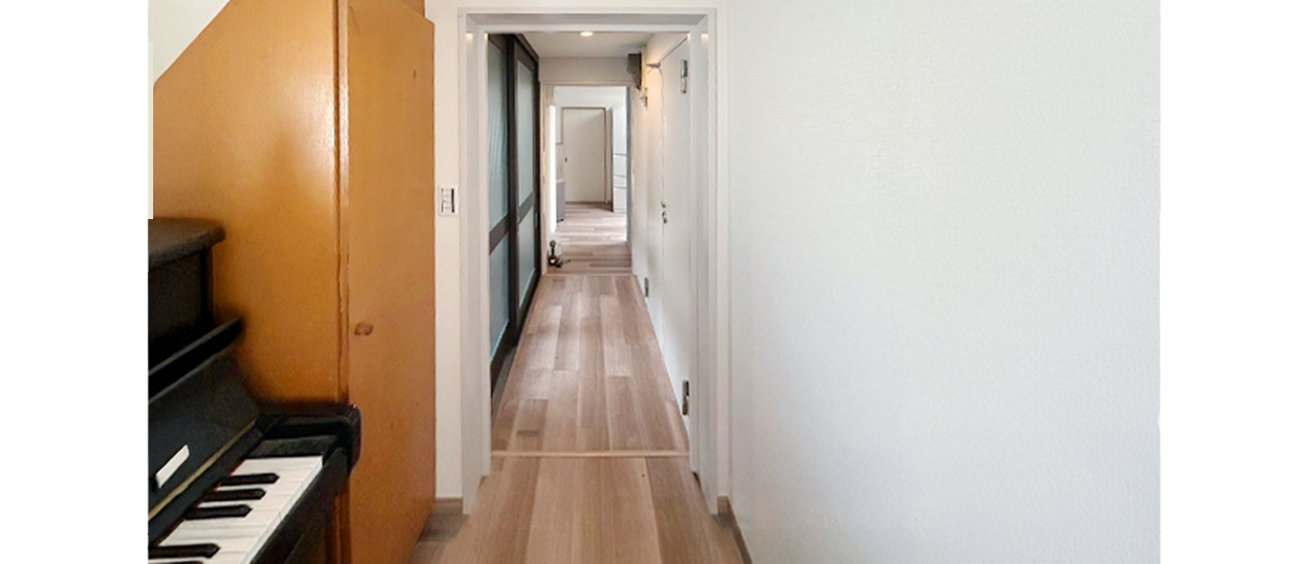 工事範囲を明確にし、無理のない工程計画を組むことで、1階店舗のオープン時期に間に合わせることができました。もともと二世帯仕様だった間取りは、フロア中央に水まわりの配管が集約されており、玄関位置の見直しが課題でした。そこで、最上階にある共有スペースを実質的な専用エリアとして取り込み、既存の引き戸を玄関ドアとして再利用。通路型の玄関動線へと再構成しました。配管位置を活かした無理のないレイアウトへ再設計することで、コストと工期を最適化。動線と使い勝手に配慮した、快適で暮らしやすい単世帯向け住空間へと生まれ変わりました。