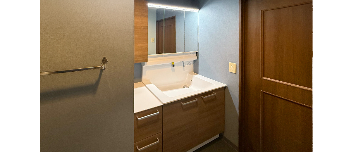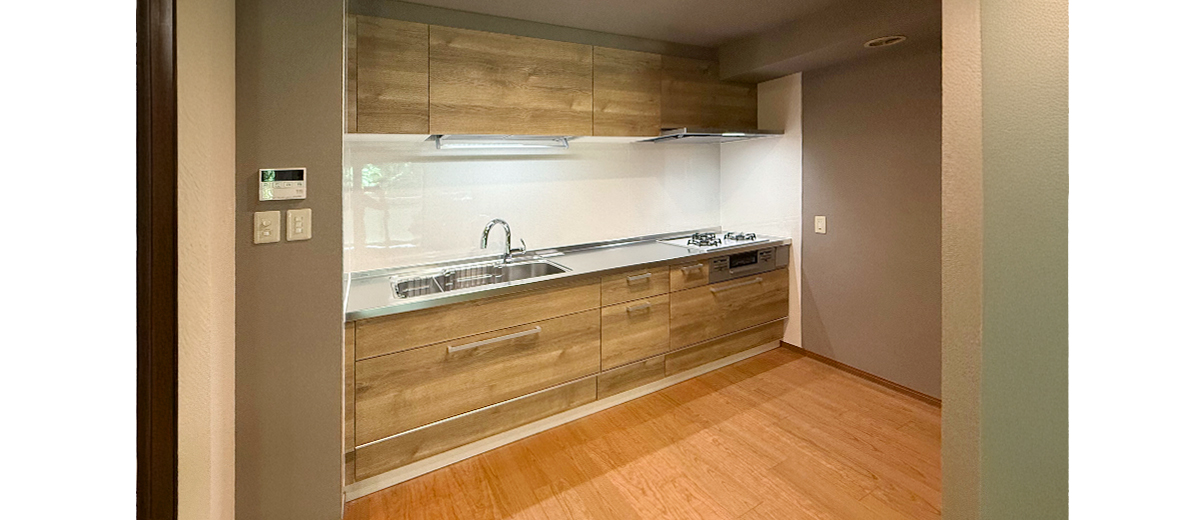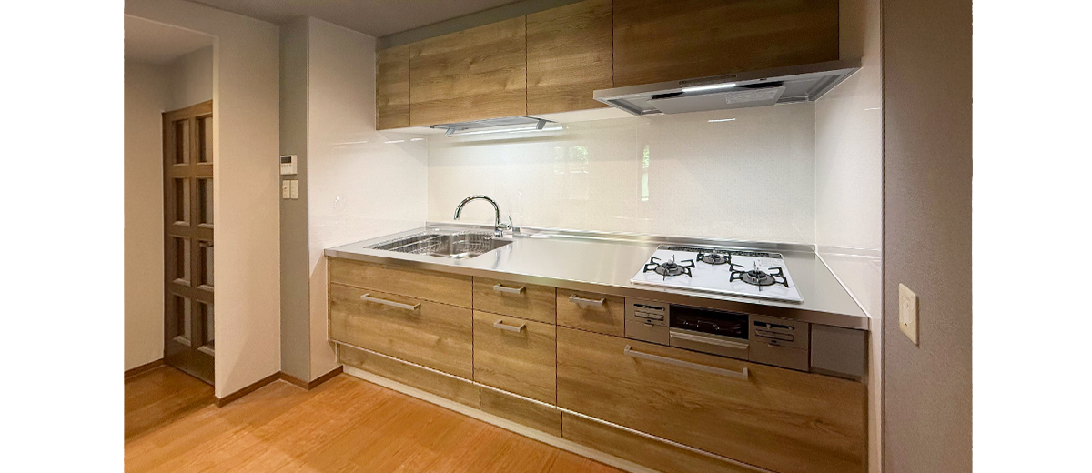キッチンは、当初ご希望いただいていた対面式から計画を変更し、一部の壁を残した壁付けスタイルを採用。リビングとの空間を緩やかに区切りながら、開放感と明るく使いやすい動線を両立したレイアウトに仕上げました。和室は壁を取り払い、リビングとひと続きの空間に変更。約5cmの段差は、安全性に配慮してスロープ状の上がり框でやさしく解消しています。水まわりは、キッチン・浴室・洗面・トイレ・給湯器をすべて新調。浴室とトイレには手すりを設置し、安心して使える仕様としました。内装は全面的にリフレッシュし、グレー系のアクセントクロスにダークトーンの設備、暖色系の照明を組み合わせることで、落ち着きのある上質な空間を演出。さらに、断熱内窓(インプラス)を採用し、快適性も大きく向上しています。