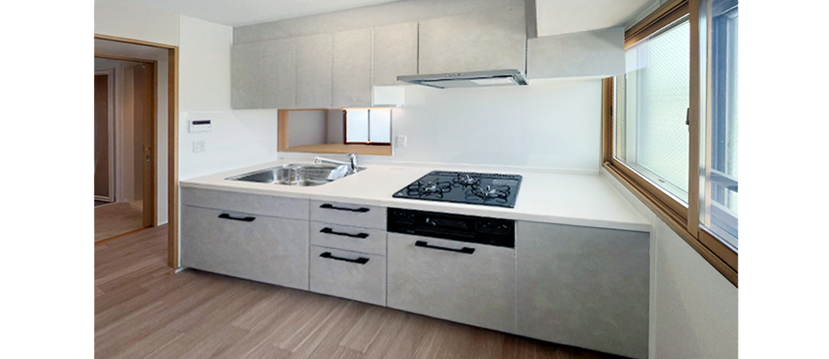 売却時の内覧で好印象を与えられるよう、室内全体のバランスを重視してリフォームしました。床は下地を丁寧に調整し、ナオスフローリングの上張りでコストを抑えながら美しく仕上げています。水まわりはキッチン・浴室・洗面・トイレをLIXIL製品で統一し、清潔感と統一感のある空間に。幅広い世代に魅力を感じていただけるお部屋に仕上がりました。