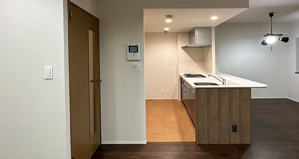 広々LDKのため和室とキッチン壁を撤去。L字カウンターはキッチンパネルで上貼りし、実用的で開放的な空間に。和室押入は収納スペースとして改修しました。浴室は1218から1318へ拡張。トイレはコルクタイル、玄関は大型タイルでイメージチェンジ。綿密な打ち合わせを重ね、デザイン性の高い理想の空間へとリフォームいたしました。