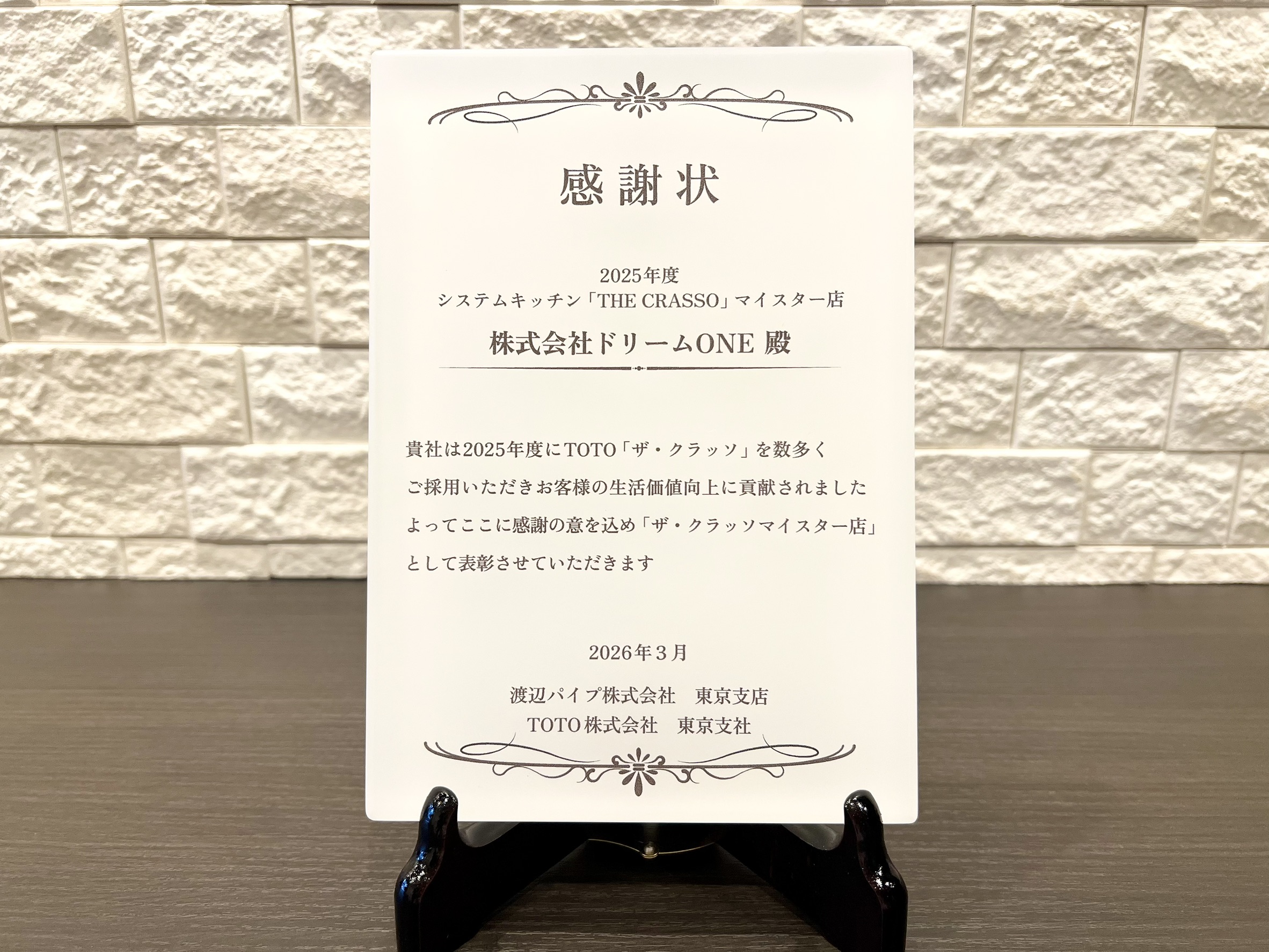 株式会社ドリームONEは、2025年度 TOTOシステムキッチン「THE CRASSO」マイスター店として感謝状をいただきました。